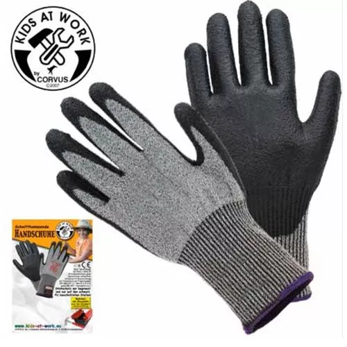 Een paar snijbeschermende werkhandschoenen maat 7/M voor de leeftijd van 10-12 jaar uit de serie Kids-at-Work van het Duitse speelgoedmerk Corvus.
