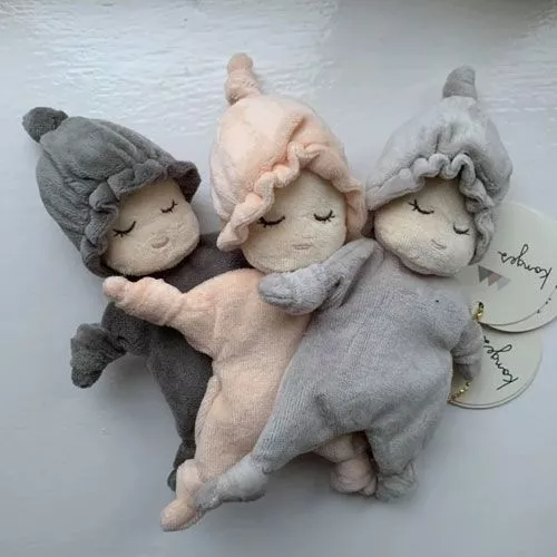 ‘Miffi Doll – Grey’ van het merk Deense merk Konges Sløjd is een vertederend en heerlijk zacht babyknuffeltje om lekker mee te kroelen en aan te sabbelen. Het fluweelzachte knuffelpopje draagt een vastzittend slaapmutsje en heeft geborduurde, gesloten ogen boven een bescheiden, bijna serene roze glimlach.