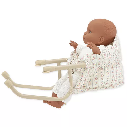 Het metalen tafelstoeltje voor poppen en knuffels kan makkelijk aan het tafelblad worden geklemd. Het is bekleed met gewatteerde stof met een klassiek bloemendesin en is mooi afgewerkt met een geschulpte rand.