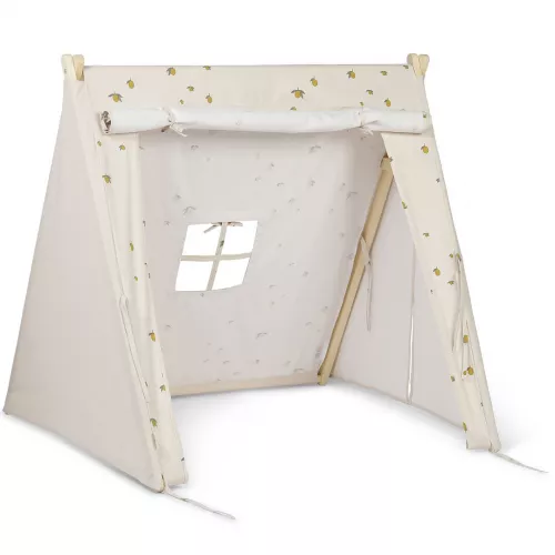 Deze speeltent ‘Lemon’ van het Deense merk Konges Sløjd biedt kinderen een heerlijk knus plekje om in te schuilen, spelen, lezen en ontspannen. Het speelhuisje bestaat uit een houten frame en een katoenen tentdoek met een dessin van citroentjes.