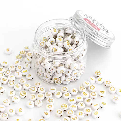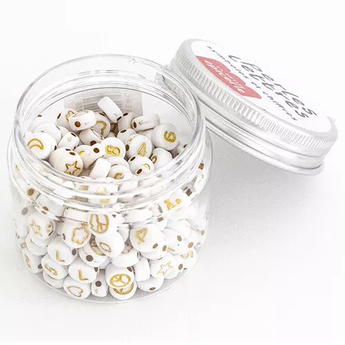 Een potje met 200 kralen in het wit met gouden opdruk van het Franse merk La Petite Épicerie. Rijg symbolen, speciale datums of cijfers in een ketting of armband.