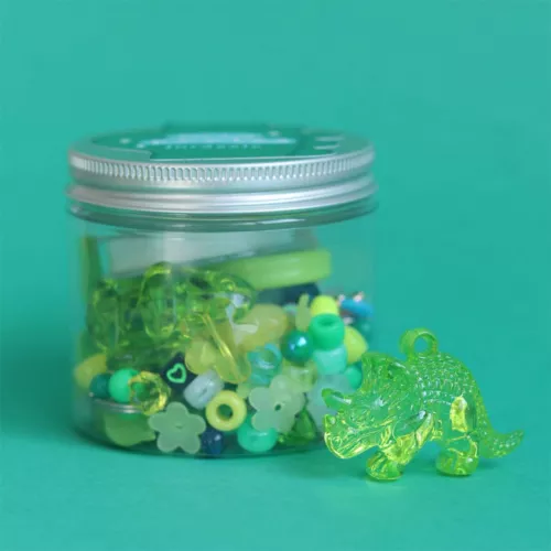 Maak prachtige sieraden en accessoires met de groene ‘Jurassic’ kralen van het Franse merk La Petite Épicerie. De knutselset bestaat uit kralen in verschillende vormen en bedeltjes in dinosaurusthema om de kindersieraden te personaliseren.