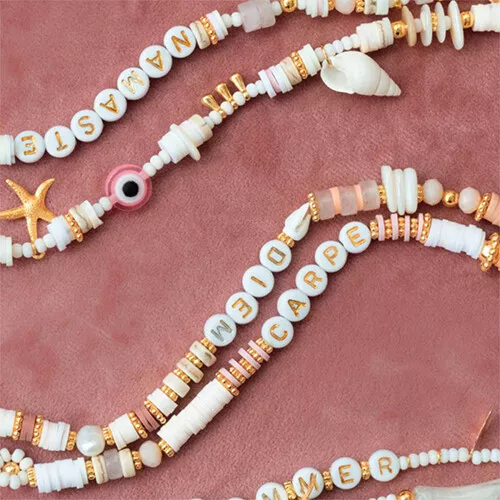 De knutselset bestaat uit verschillende kleuren Heishi-kralen, kralenverdelers, letterkralen en bedeltjes.