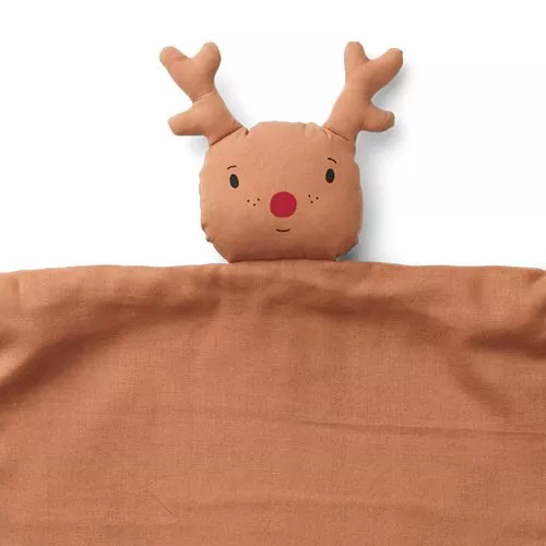 Een zachte knuffeldoek ‘Agnete cuddle cloth – reindeer tuscany rose’ van het Deense merk Liewood om mee te tutten en frutten.
