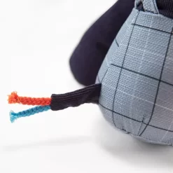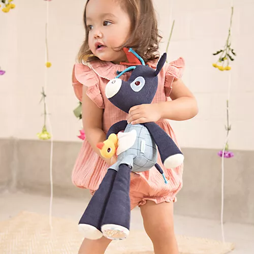 De ezelknuffel heeft speelse oortjes om aan te frummelen, een bijtring aan zijn arm en een spiegeltje onder zijn voet. Als hij zwaait met zijn ronde poten rinkelt er een belletje. Uit het buideltje op zijn buik komt een knuffeleendje tevoorschijn.