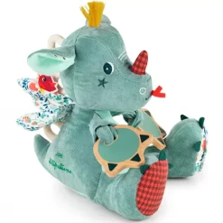 Deze hartveroverende knuffeldraak Joe de ‘Multi-activiteitendraak’ van het Belgische merk Lilliputiens weet nieuwsgierige baby’s te vermaken.