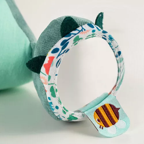 De knuffeldraak bevat knisperende vleugels om aan te frummelen, een spiegeltje onder zijn voet en zijn houten poten klapt hij vrolijk tegen elkaar. De verschillende materialen en texturen van de knuffel voelen heel interessant aan voor kleine handjes.