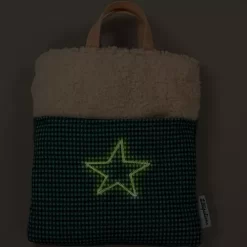 Het poppenbedje doet door de hendels tevens dienst als tas om de speelset in op te bergen en mee te nemen. Het tasje is versierd met een glow-in-the-dark ster.