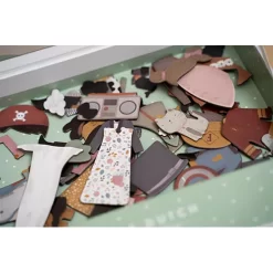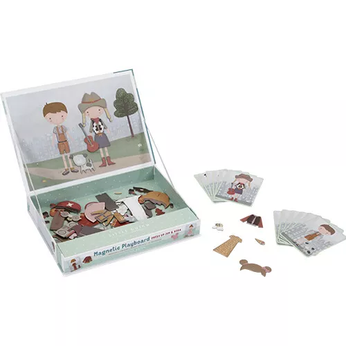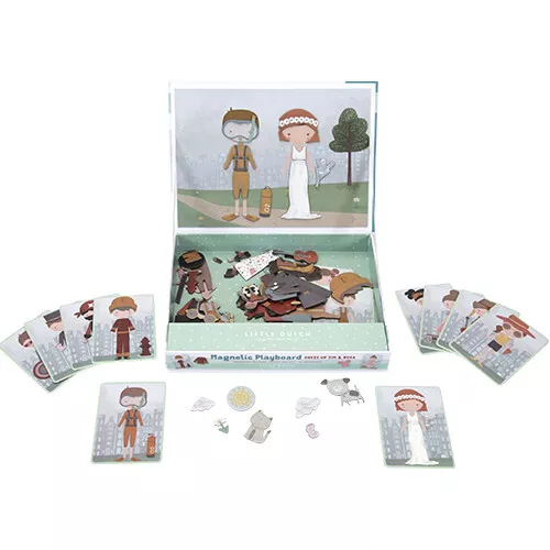 Geef Jim en Rosa een hippe, klassieke of bruidsoutfit met dit magneetboek ‘Magnetisch speelboek Rosa en Jim’ van het Nederlandse merk Little Dutch. Met deze magnetische puzzel kunnen de outfits van Rosa en Jim, die op kaartjes staan, nagemaakt worden. Of verkleed ze volgens eigen fantasie. Er zijn eindeloze combinaties mogelijk die speelplezier garanderen en de woordenschat en coördinatie aanmoedigen. Thuis, maar ook onderweg.