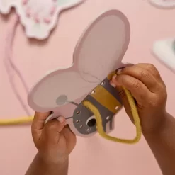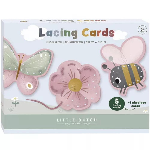 Voor natuurliefhebbers zijn er deze vijf rijgkaarten uit de Flowers & Butterflies collectie van het Nederlandse merk Little Dutch. Deze set bestaat uit 5 grote, stevige kartonnen kaarten, met afbeeldingen van onder andere een bij, bloem en vogeltje. Haal de veter door de kleine gaatjes om details toe te voegen aan bijvoorbeeld het lijfje van de bij of aan de bloemblaadjes.
