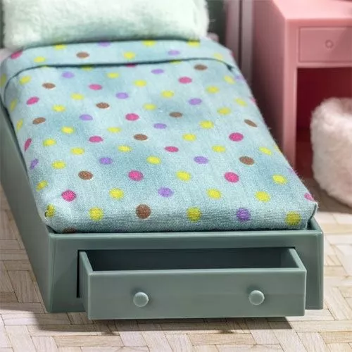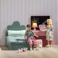 Met deze poppenmeubels- en accessoires van het Zweedse merk Lundby kan de kinderslaapkamer van het poppenhuis smaakvol worden ingericht.