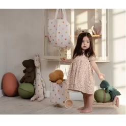 Onderin is de knuffeldino gevuld met korreltjes. Dat voelt grappig aan voor kinderhandjes en helpt de knuffel bij het zitten en het staan. Gemeten van kop tot teen.