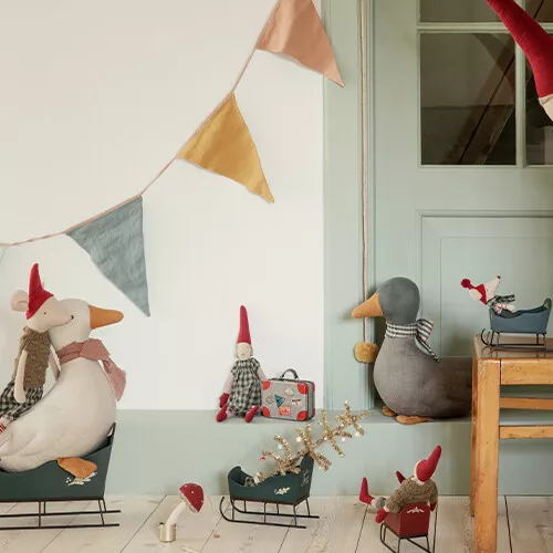 De knuffeltjes genieten comfortabel van de sneeuw in deze grote houten slee. De ‘Sleigh – Mouse – Red’ van het Deense merk Maileg is er voor kleine knuffeltjes die houden van sneeuwpret.