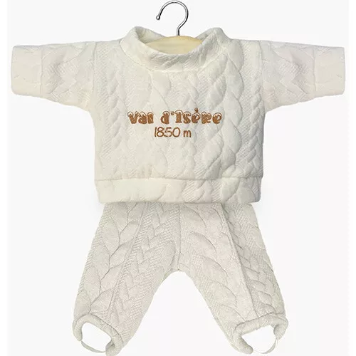 Met deze behaaglijke, gebreide poppenkledingset ‘Jérôme Jacquard Ecru’ uit de Tout Schuss collectie van het Franse merk Minikane is de babypop helemaal klaar voor de winter.