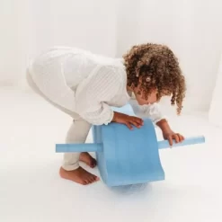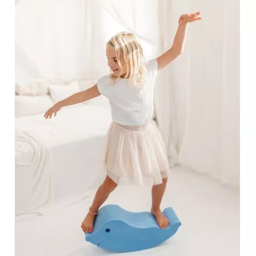 Wiebelen, wiegen, overheen lopen en balanceren. Dit tuimelmeubel ‘Dolphin’ van het Belgische merk Moes Play is een schommelstoel, balanceerbord en stapsteen in één. Speelgoed dat ongemerkt de motoriek en spieren versterkt.