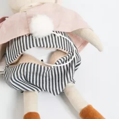 De lieve kinderknuffel draagt een gestreept broekje, oranje schoentjes en een linnen cape. Met haar geborduurd snoet en lange flaporen van fleece is ze al snel een favoriet.