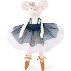 De muizenknuffel draagt een roze tutu, heeft een bloemetje op haar bolletje en balletschoenen met gouden lintjes. In haar kledingkast heeft ze een houten rail met bijbehorende hangers, een spiegel en twee andere balletjurkjes. De jurkjes hebben een rok van tule met glittertjes, elk in een andere kleur. Klaar voor elke gelegenheid!