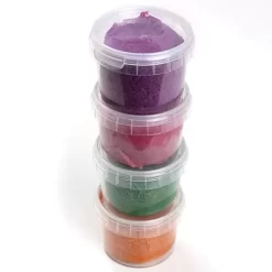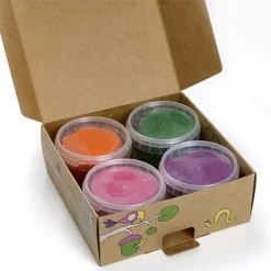 De boetseerklei in het oranje, groen, roze en violet is gemaakt van natuurlijke en milieuvriendelijke grondstoffen en voldoet aan ecologische en veganistische normen.