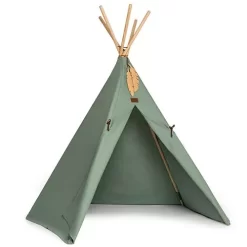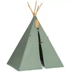 Een groene tipi speeltent ‘Nevada Tepee Eden Green’ uit de Pure Line serie van het Spaanse merk Nobodinoz versierd met twee houten veren in de nok.