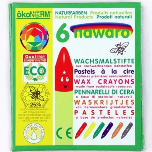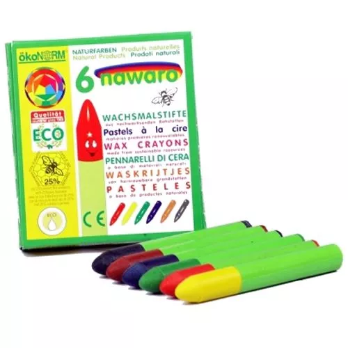 Zes gekleurde wascokrijtjes ‘Mini Wax Crayons nawaro’ van het Duitse merk ökoNorm. De waskrijtjes liggen prettig in de kinderhand.