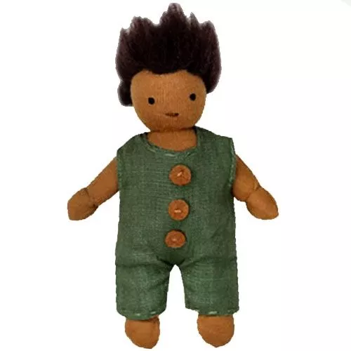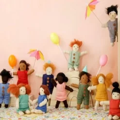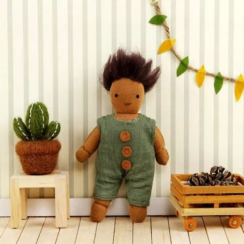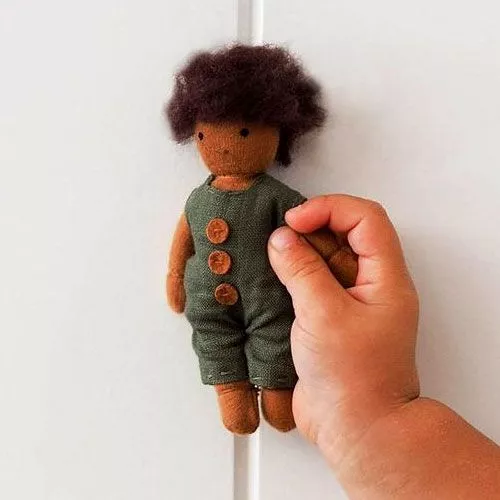 Poppenhuispopje ‘Moss’ uit de twaalfdelige ‘Holdie Folk’ serie van het Engelse merk Olli Ella. Deze handgemaakte speelgoedpopjes wonen in en om het houten ‘Holdie’ poppenhuis, maar feitelijk maakt het ze niets uit waar ze wonen. De kleine lappenpopjes hebben een perfect formaat voor kleine kinderen om overal mee naar toe te nemen of in te stoppen.