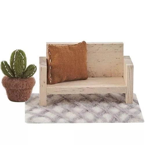 De speelgoed woonkamer bestaat uit een houten bankje en linnen kussen, met vilten tapijt en cactusplant.