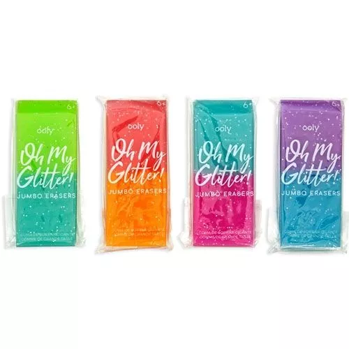 Schrijf- of tekenfoutjes met potlood kunnen eenvoudig worden uitgewist met deze ‘Oh My Glitter! – Jumbo Eraser’ van het Amerikaanse merk Ooly. Deze gum ziet er glamorous uit met de glitters en verschillende catchy kleurencombinaties.