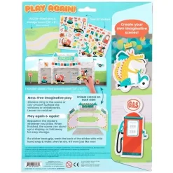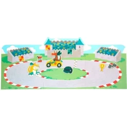 Het stickerscherm is een drieluik met aan de ene zijde een garage en aan de andere zijde een racebaan. Met extra dubbelzijdig speelbord om de stickers op te bewaren.
