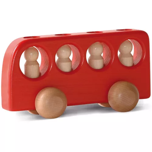 Deze rode, houten speelgoedbus met vier passagiers van het Duitse merk Ostheimer is klaar om te vertrekken. De poppetjes kunnen via openingen in de bus geplaatst worden en zitten stevig op hun plek tijdens het rijden.