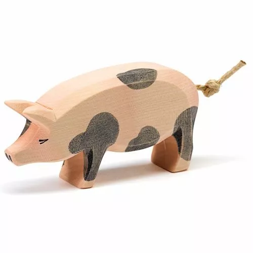 Een houten roze-grijs gevlekt varken met zijn kop omhoog van het Duitse merk Ostheimer. Mooi houten speelgoed, dat met de hand gemaakt en beschilderd is.