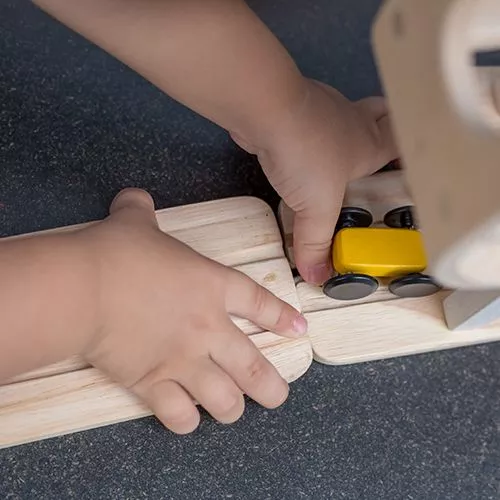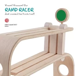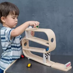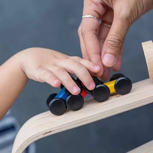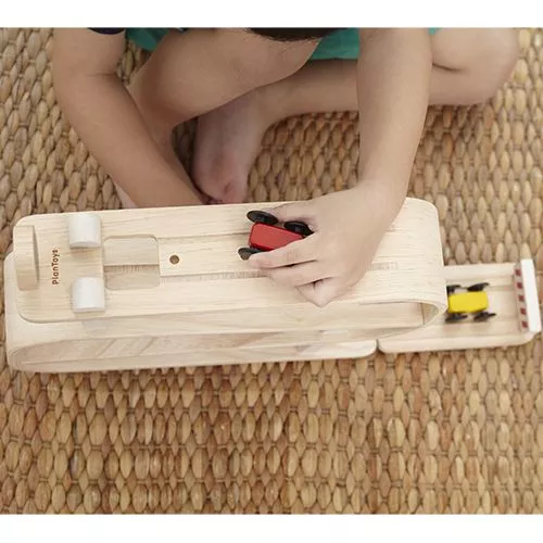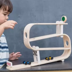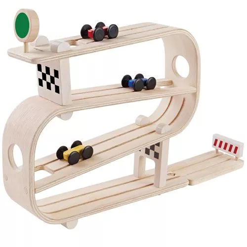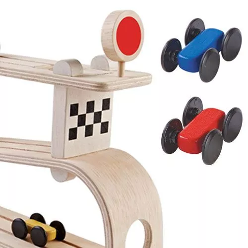 Een gestroomlijnde houten race traject en drie snelle autootjes van het merk Plan Toys.