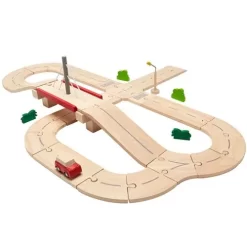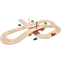 Puzzel een eigen ontworpen autoweg in elkaar met de ‘Road System Set’ van het merk Plan Toys. De houten baandelen passen als puzzelstukjes in elkaar en kunnen naar eigen ontwerp aan elkaar worden gelegd.