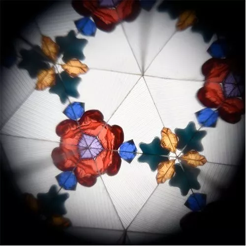 De speelgoed kaleidoscoop is gemaakt van stevig karton en heeft een diameter van 4,5 cm.