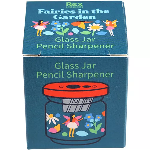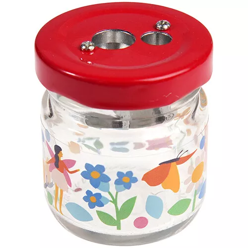 Het glazen potje met ‘Fairies in the Garden’ illustraties heeft een deksel, waaraan een puntenslijper bevestigd is. Met de dubbele puntenslijper zijn zowel dunne als dikke potloden te slijpen.