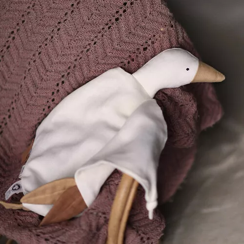 Zoeken naar de speen is niet meer nodig met dit zachte speendoekje met gans ‘Cuddle Cloth Goose – Ice Blue’ van het Deense merk Saga Copenhagen.