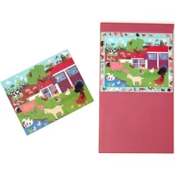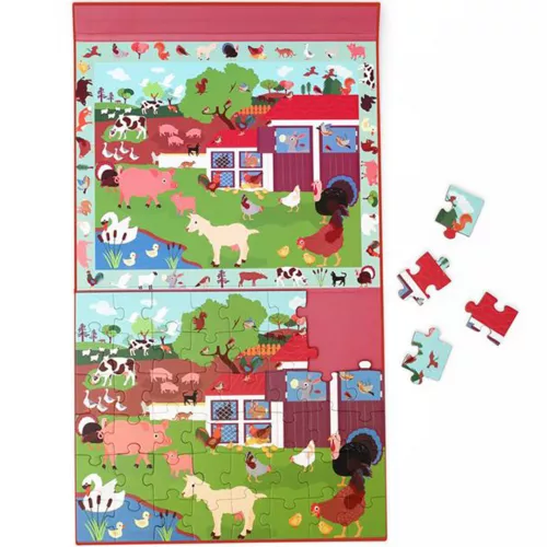 Een uitklapbare map met een magnetische puzzel ‘Discovery – Boerderij’ met een landschap van het boerenleven van het Belgische merk Scratch Europe. Het puzzelboek bestaat uit twee vlakken, waar bovenaan te zien is hoe de puzzel moet worden en onderaan de puzzel op het magneetvlak nagemaakt kan worden.