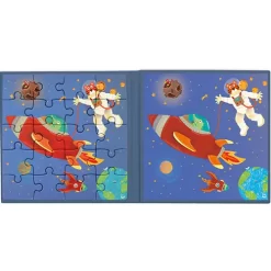 Een magnetisch, uitklapbaar puzzelboek ‘Magnetic puzzle to go’ met een avontuur vanuit de ruimte van het Belgische merk Scratch Europe. Het puzzelboek bestaat uit 2 puzzels van 20 stukjes. In de auto, de trein of restaurant; de puzzelstukjes blijven aan het boek zitten.