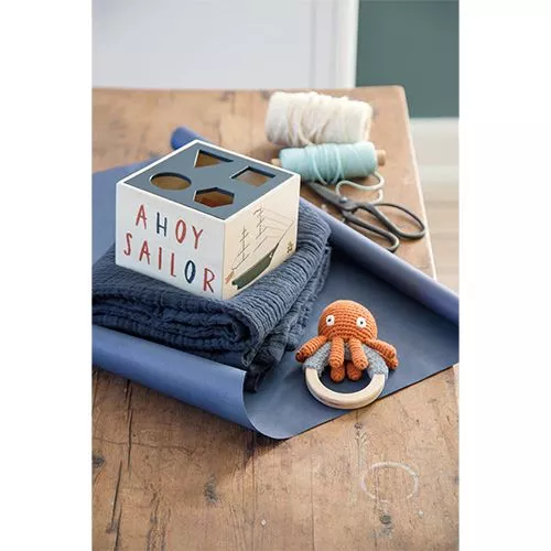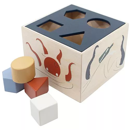 Een houten vormenstoof ‘Wooden shape sorter – Seven Seas’ van het Deense merk Sebra. Puzzelen, op kleur sorteren, stapelen… Nostalgisch kinderspeelgoed met boordevol speelmogelijkheden voor de kleine peuter! Op de vormendoos zijn maritieme elementen te zien zoals Morgan de octopus en een schip.