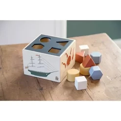 De vormendoos heeft vier verschillende geometrische gaten in de donkerblauwe deksel en acht blokken die variëren in vormen en tinten. Kinderen leren kleuren en vormen herkennen met deze vormenstoof.