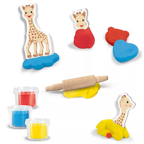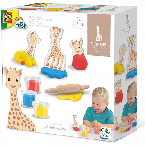 Met deze zachte, gekleurde boetseerklei van het Nederlandse merk SES Creative maken kinderen vrolijke figuurtjes met Sophie de Giraf. De creatieve kleiset bestaat uit een houten deegroller, zes foamfiguren van Sophie de Giraf en drie potjes klei in de kleuren rood, geel en blauw.