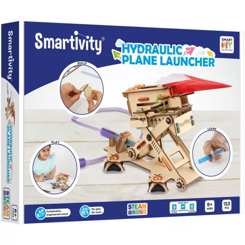 Maak verschillende vliegtuigmodellen die in de doos zitten of maak een eigen model en kleur het in met stiften of potloden. Deze set laat knutselen en bouwen samenkomen met techniek, want als het lanceerplatform klaar is, kan de spuit met water gevuld worden. Nu is het lanceerplatform klaar om papieren vliegtuigjes en raketten te lanceren!