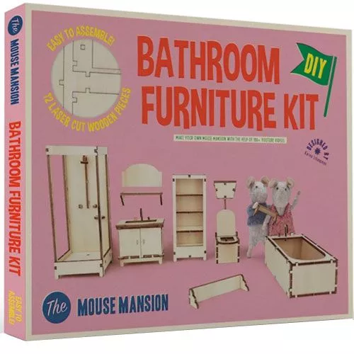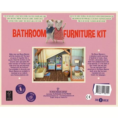 Dit houten bouwpakket ‘Mouse Mansion Furniture Kit – Bathroom’ van het Nederlandse merk Studio Schaapman is een DIY knutselpakket gebaseerd op de Muizenhuis kinderboeken van Karina Schaapman. Met deze bouwset kunnen kinderen hun eigen poppenmeubeltjes maken en hun muizen- of poppenhuis zelf inrichten en versieren.