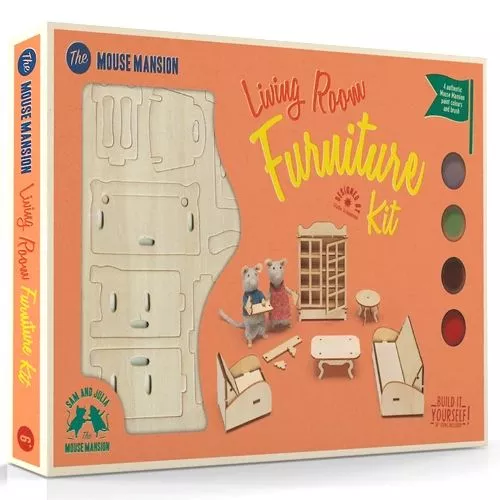 Dit houten bouwpakket ‘Mouse Mansion Furniture Kit – Living Room’ van het Nederlandse merk Studio Schaapman is een DIY knutselpakket gebaseerd op de Muizenhuis kinderboeken van Karina Schaapman. Met deze bouwset kunnen kinderen hun eigen poppenmeubeltjes maken en hun muizen- of poppenhuis zelf inrichten en versieren.