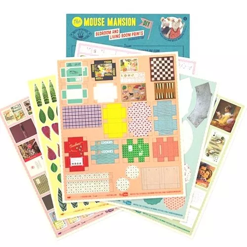 Een set van zes knutselvellen ‘Mouse Mansion knipvellen Woon/Slaapkamer’ van het Nederlandse merk Studio Schaapman. Met dit DIY knutselpakket gebaseerd op de Muizenhuis kinderboeken van Karina Schaapman kunnen kinderen hun eigen muizen- of poppenhuis prachtig versieren.