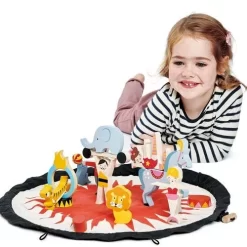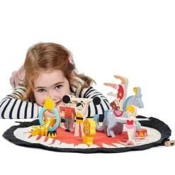 Een hele trits speelgoed circusartiesten- en figuren van het Engelse merk Tender Leaf Toys in een handige opbergzak die uitgevouwen ook dienst doet als circusarena. De houten speelfiguren hebben een retro-look en zijn aan beide zijden gezeefdrukt met innemende illustraties van acrobaten en circusdieren.