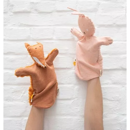 Deze guitige handpop ‘Handpuppet – Mr. Fox’ van het Belgsche merk Trixie kan niet wachten om mee te spelen in een poppenshow. Speelgoed dat de verbeeldingskracht stimuleert. Met een ruggetje van corduroy om fijn overheen te aaien.