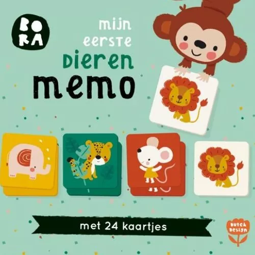 In het memoriespel ‘Mijn eerste dierenmemo’ van de Nederlandse illustratrice Deborah van de Leijgraaf komen Egel, Hondje, Kleine Muis, Eekhoorn en alle andere dierenvrienden voorbij – wie weet als eerste waar de twee bij elkaar horende kaartjes liggen?