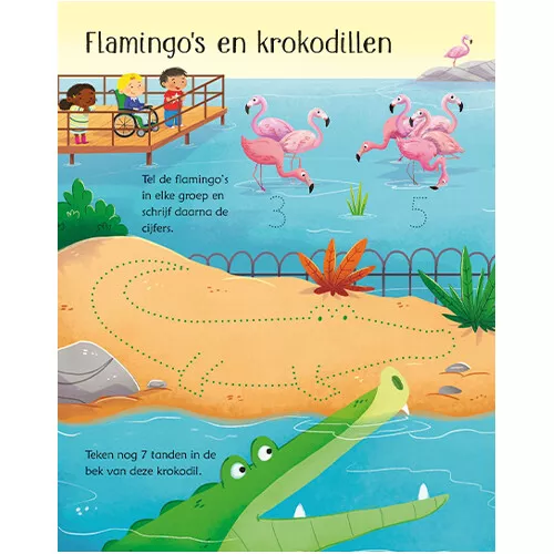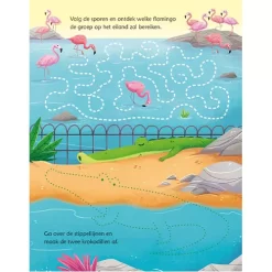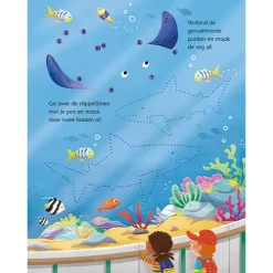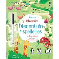 Een kleurrijk doeboek ‘Dierentuinspelletjes’ met zoekplaatjes, doolhoven, puzzels, verbind de puntjes en tel- en tekenspelletjes. De spelletjes met allerlei dieren uit de dierentuin zijn keer op keer te maken met de bijbehorende uitwisbare pen.